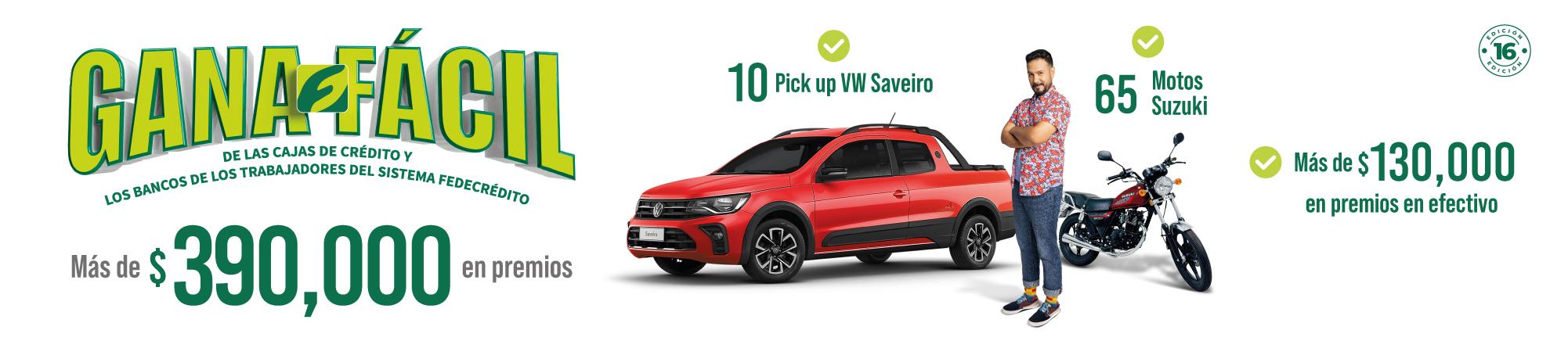 Participa y gana con la Promoción GANA FÁCIL. Son más de $390,000 en premios para 710 de 10 Pick Up VW Saveiro, 65 motos Suzuki y más de $390,000 en premios en efectivo.